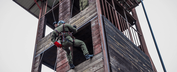 Изучение основ альпинистской подготовки, вязание разных типов узлов, принцип работы спусковых устройств, работа на вертикале здания